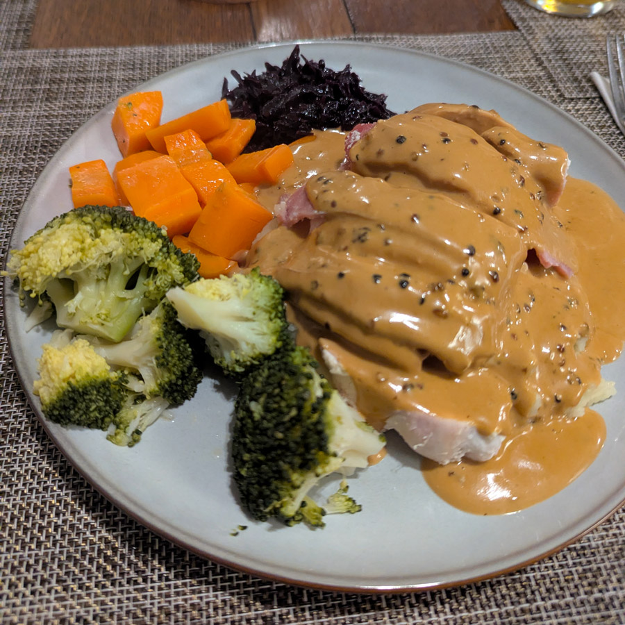 Succulent beef in a rich onion gravy topped with puff pastry, seasonal veg and mash or chips
