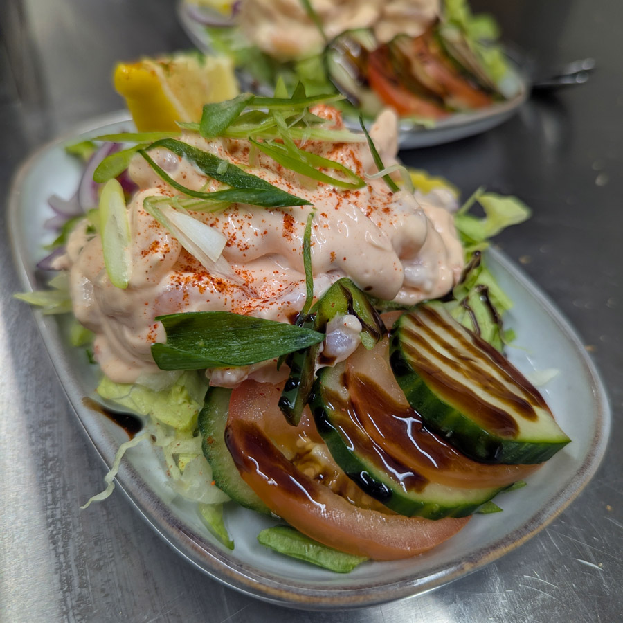 Served on a brioche bun with lettuce, mayo, cheese with salad and chips
